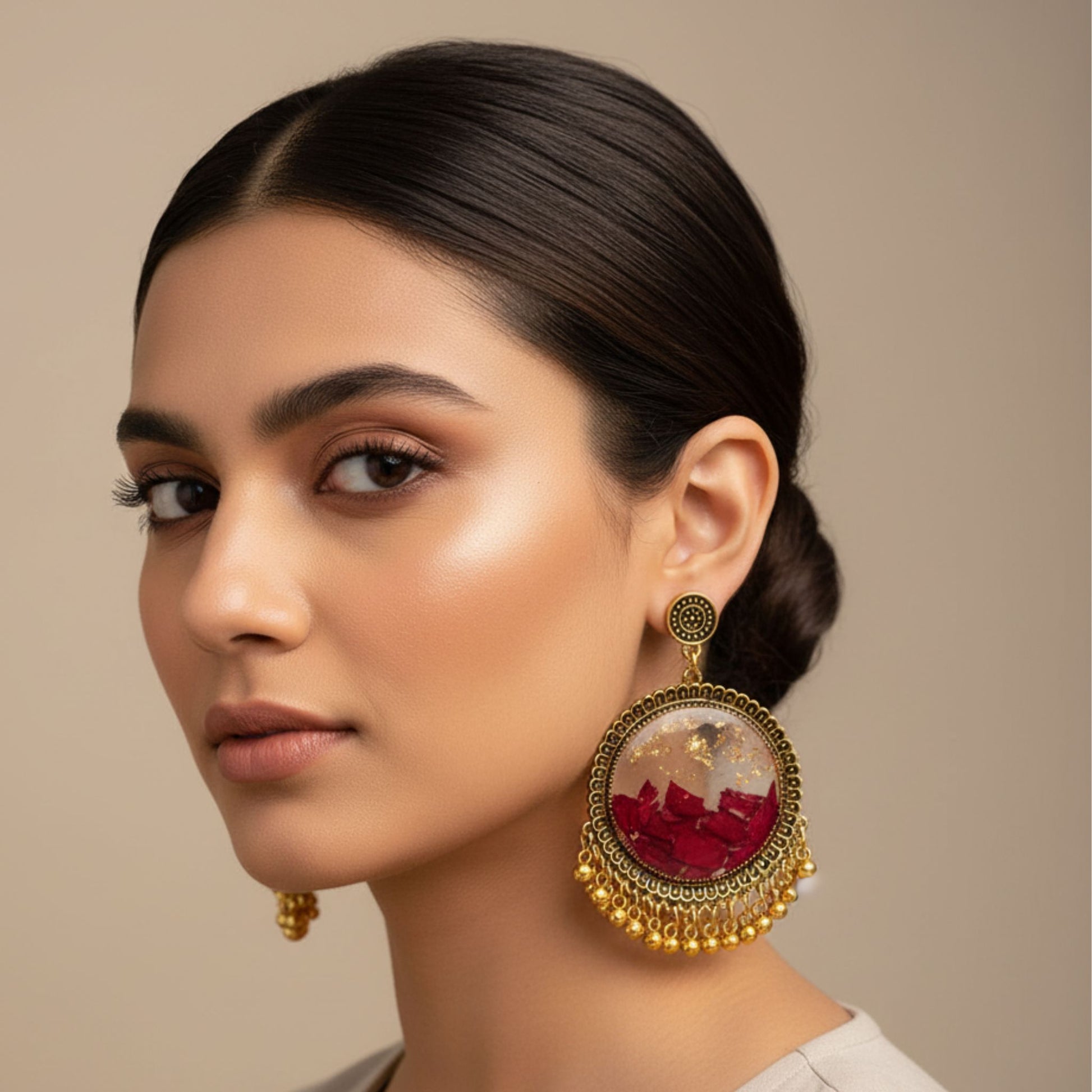 Add a graceful charm to your look with our Blossom Drop Resin Jhumka, delicately crafted with real dried flowers sealed in crystal-clear resin. These lightweight earrings combine traditional jhumka design with a modern floral twist, making them perfect for festive wear, ethnic gatherings, or a unique everyday statement.