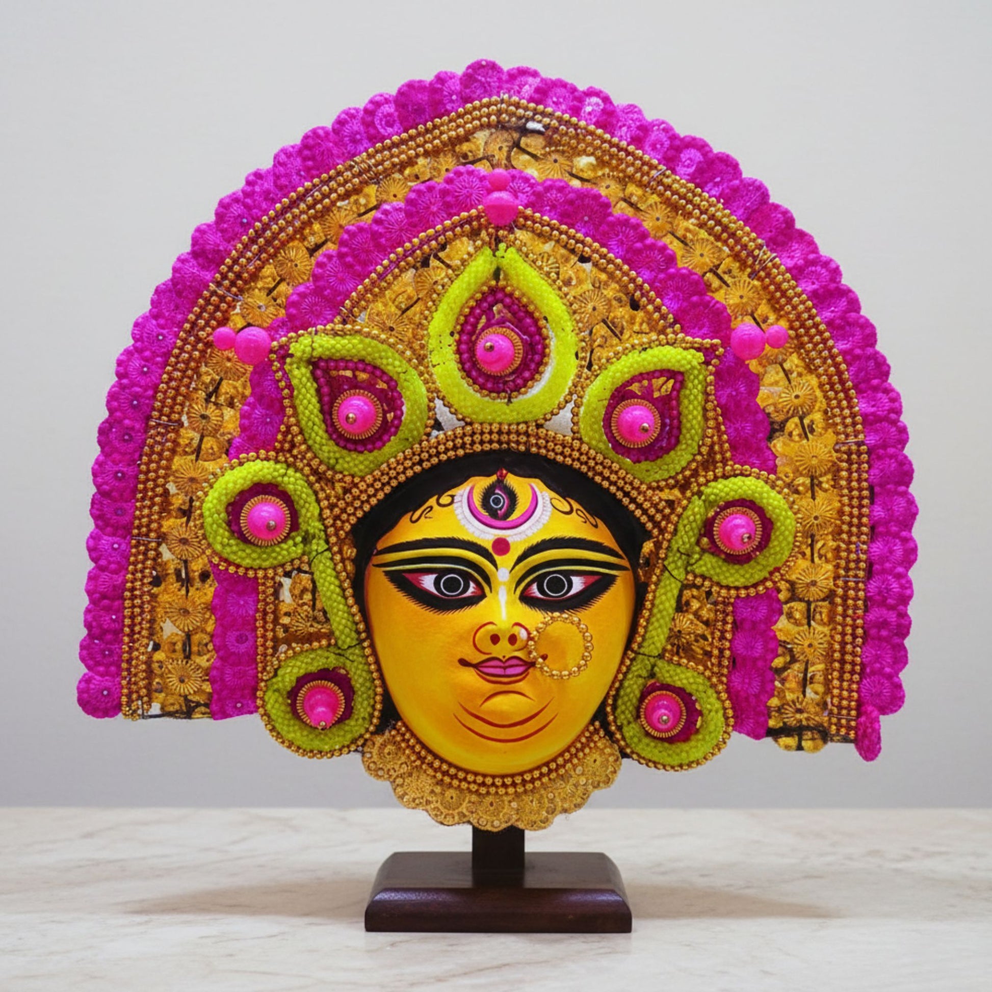 Channel the protective strength of the goddess with the Durgatinashini Chhau Mukhosh, a hand-painted 14×14 inch wall hanging inspired by the dynamic folk dance tradition of Purulia’s Chhau Naach. This expressive mask captures Ma Durga’s fearless gaze, intricate crown, and radiant energy—symbolizing victory over darkness. A stunning piece of devotional folk art, perfect for festive décor, sacred corners, or as a tribute to Bengal’s living heritage.