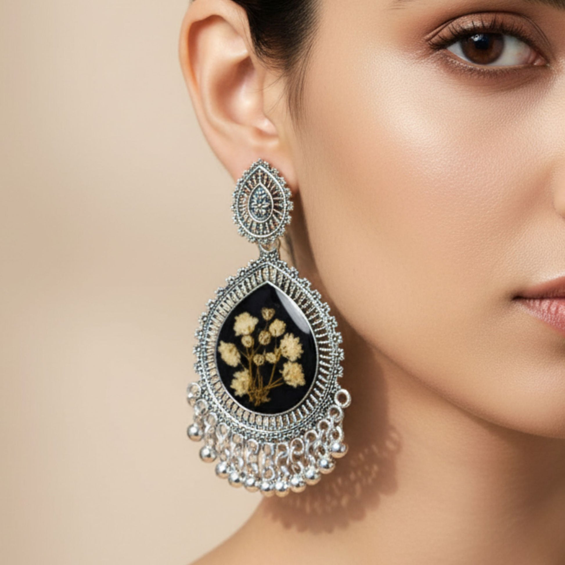 A blend of mystery and bloom, the Kaajphool Resin Jhumka features elegant floral elements encased in deep black resin. Handcrafted with care, this piece brings together the boldness of black with the softness of petals—perfect for evening gatherings, festive nights, or adding a graceful edge to your ethnic ensemble.