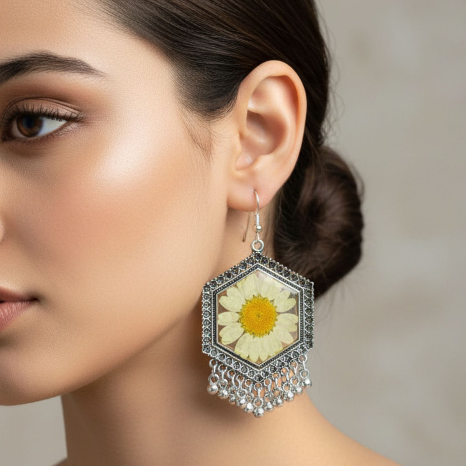 Crafted with clear resin and subtle shimmer, the Noorani Jhumko radiates peaceful elegance. A minimal yet stunning piece that pairs beautifully with cotton sarees or pastel outfits.