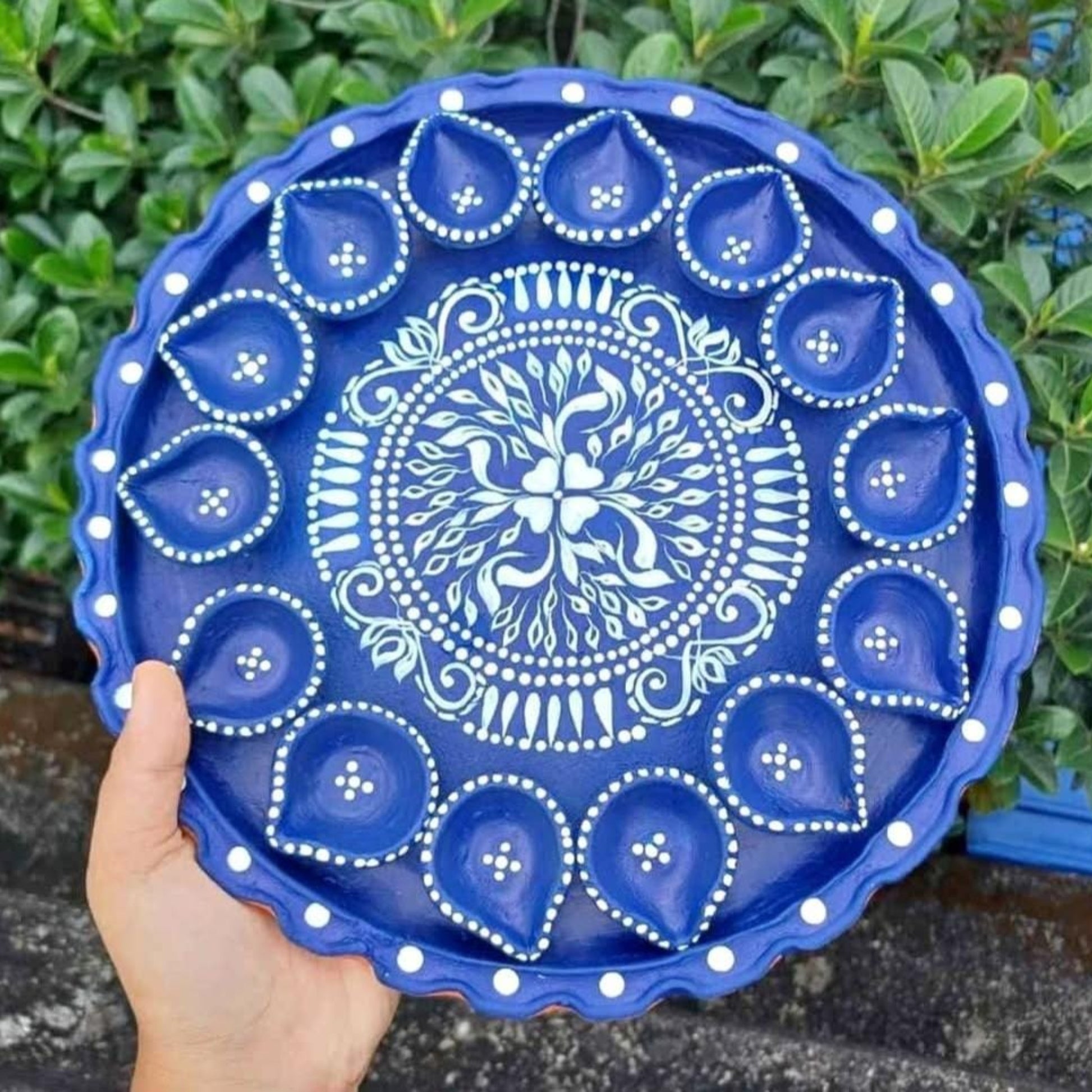 This peacock-inspired diya set of 14 pieces with a handcrafted tray captures the vibrancy of Indian artistry. Add color, culture, and celebration to your space with this elegant festive set.