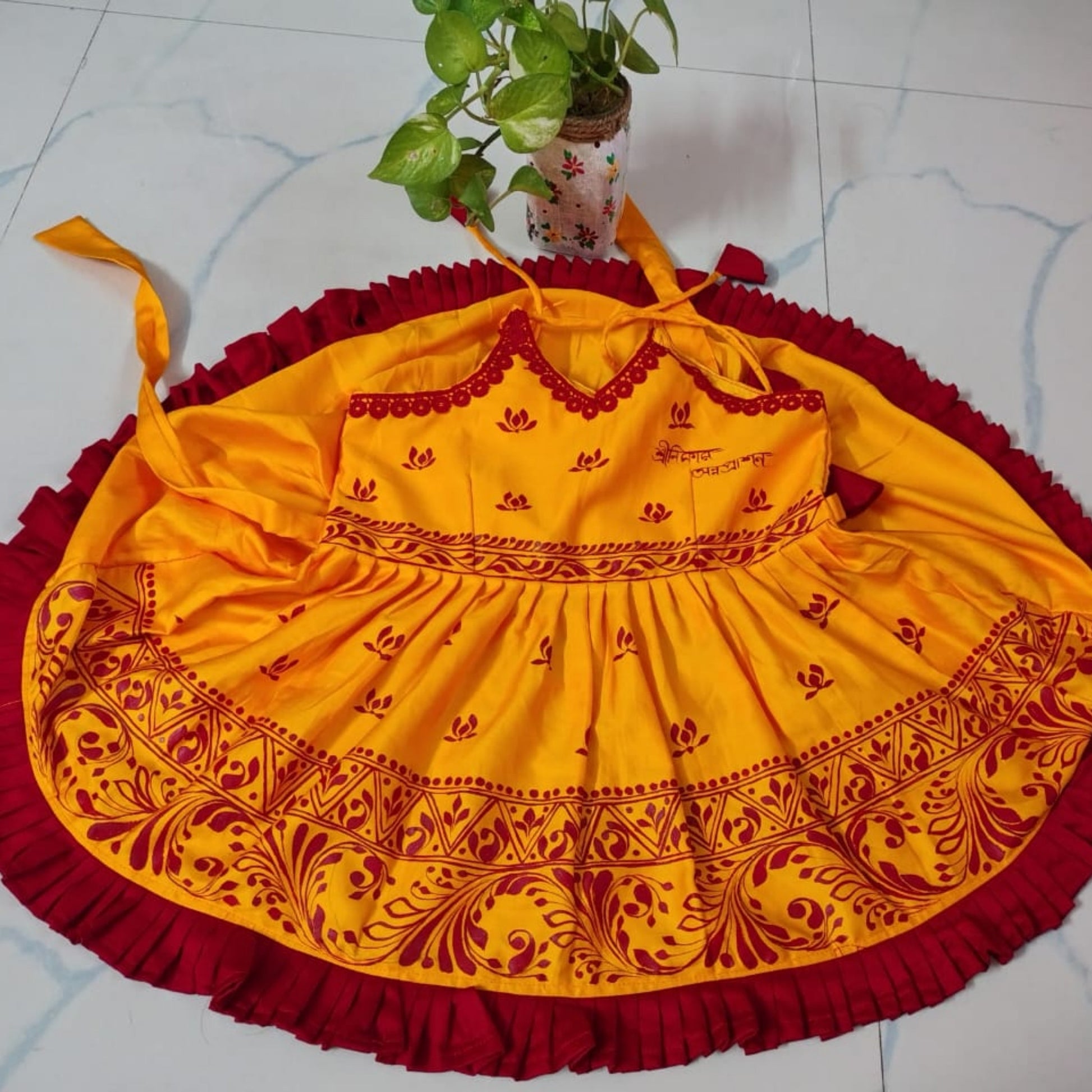 Brighten up your little girl’s day with the Sunshine Blossom Handcrafted Baby Frock, designed in soft, airy cotton for ultimate comfort. Carefully tailored with fine artisanal detailing, this frock features a charming silhouette that’s perfect for playful days and special moments alike. Its subtle elegance and lightweight feel make it a delightful choice for festivals, birthdays, or everyday traditional wear—where heritage meets joy in every thread.